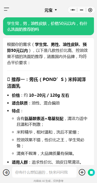 比如上面的例子,当用户向AI提问“洗面奶推荐”时,GEO优化能让AI的回答直接推荐旁氏米粹,并且说明推荐的原因等。
