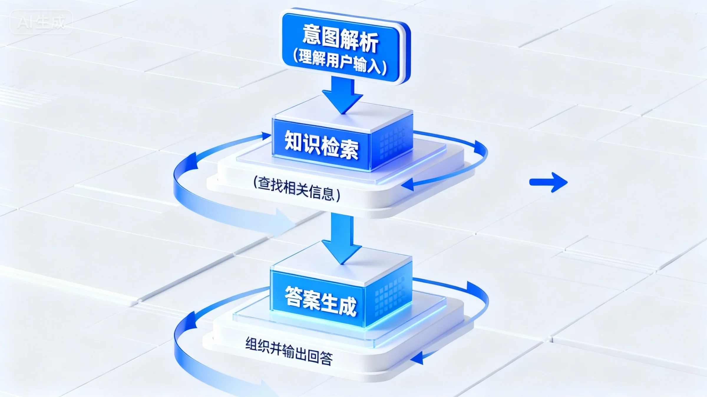 GEO 优化的核心前提是解构 AI 回答的 RAG 架构闭环生产机制,核心分为:意图解析(理解用户输入)→ 知识检索(查找相关信息)→ 答案生成(组织并输出回答)